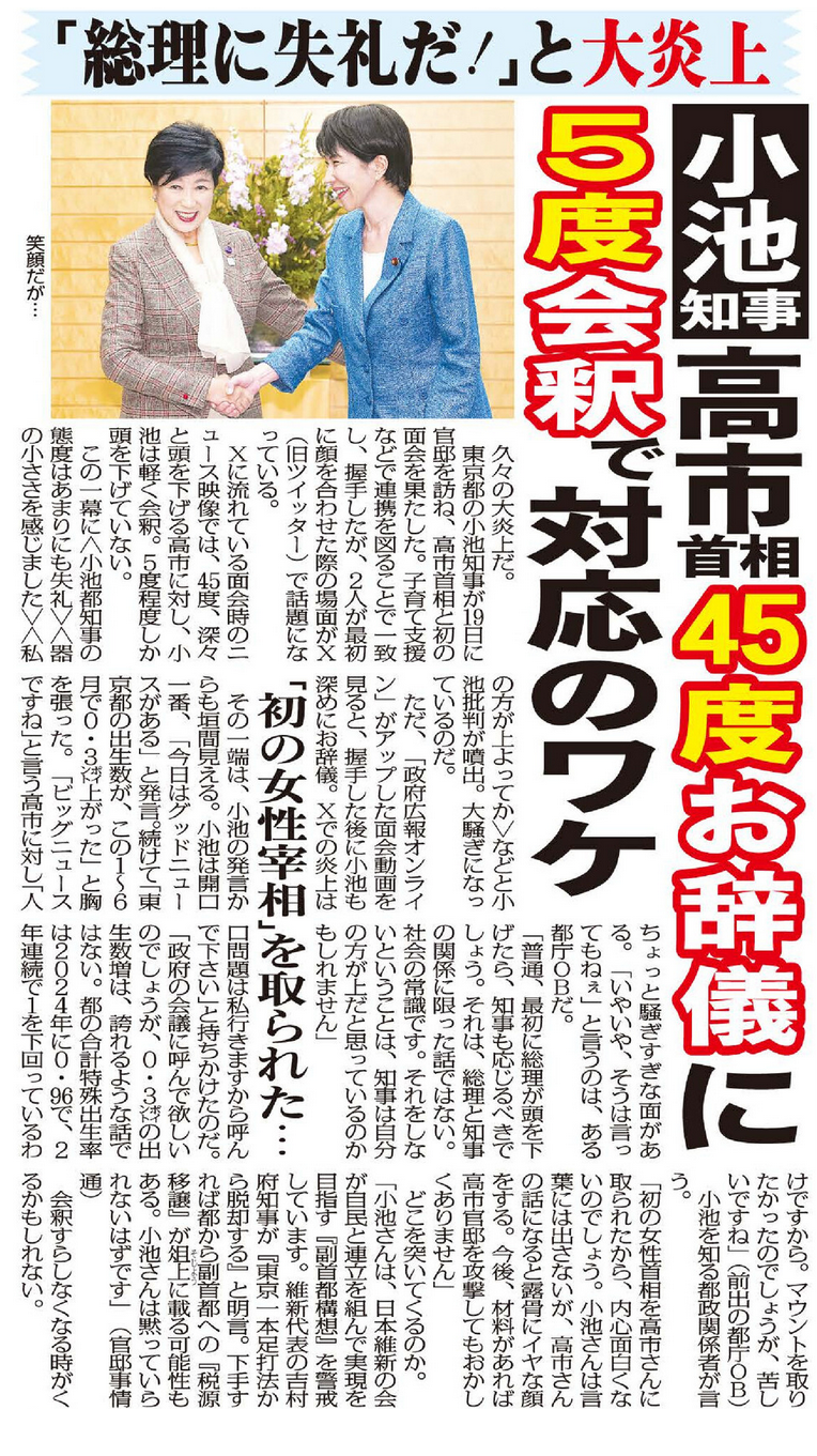 「総理に失礼だ!」と小池都知事が大炎上…高市首相“45度お辞儀”に“5度の会釈”で対応したワケ