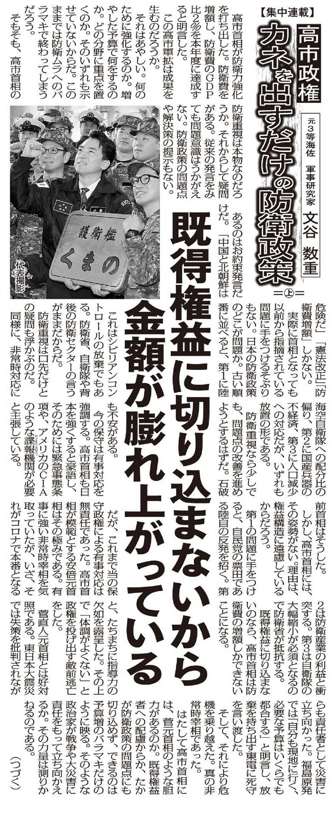 はたして高市首相には、菅元首相のような胆力があるのか。既得権益者への配慮からか、たかが防衛政策の問題点にも切り込めず、できるのは予算増のバラマキだけのように映る。そのような政治家が戦争や大災害に責任をもって立ち向かえるか。その力量は測りかねるのである。 (つづく)