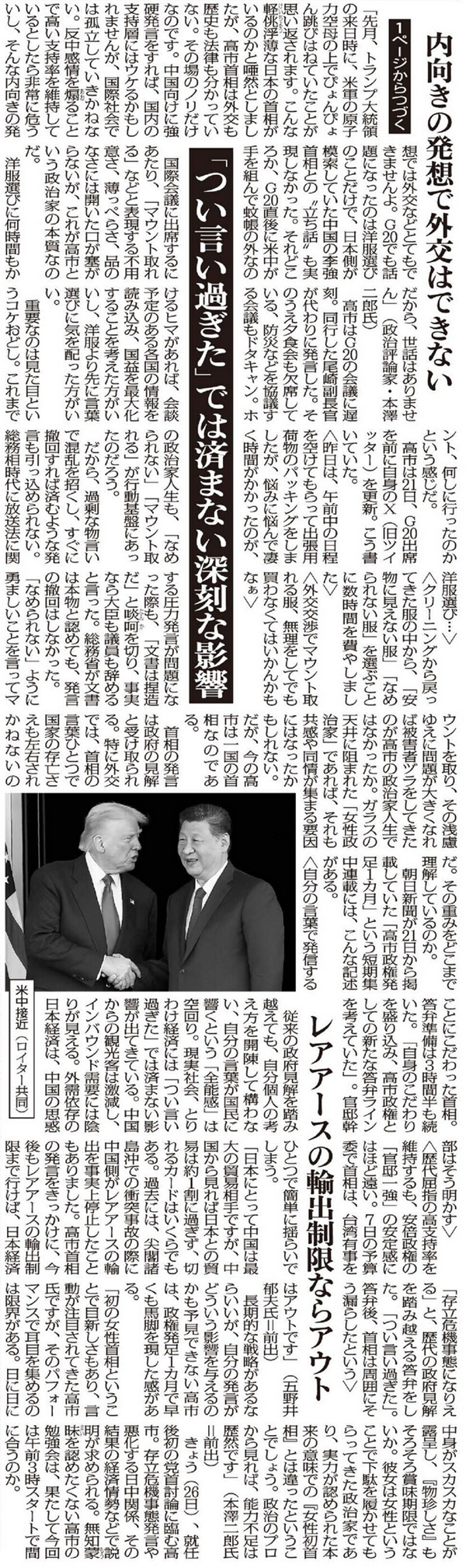 従来の政府見解を踏み越えても、自分個人の考え方を開陳して構わない、自分の言葉が国民に響くという「全能感」は空回り。現実社会、とりわけ経済には「つい言い過ぎた」では済まない影響が出てきている。中国からの観光客は激減し、インバウンド需要には陰りが見える。外需依存の日本経済は、中国の思惑ひとつで簡単に揺らいでしまう。