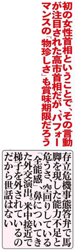 初の女性首相ということで、その言動が注目された高市首相だが、パフォーマンスの「物珍しさ」も賞味期限だろう。存立危機事態答弁で馬脚を現した能力不足と危うさ、空回りしている「全能感」、鼻についてきた外交演出。米中接近で梯子を外されているのだから世話はない。