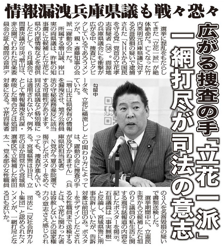 「立花一派」の一網打尽が司法の意志…広がる捜査の手に内部情報漏した兵庫県議2人も戦々恐々