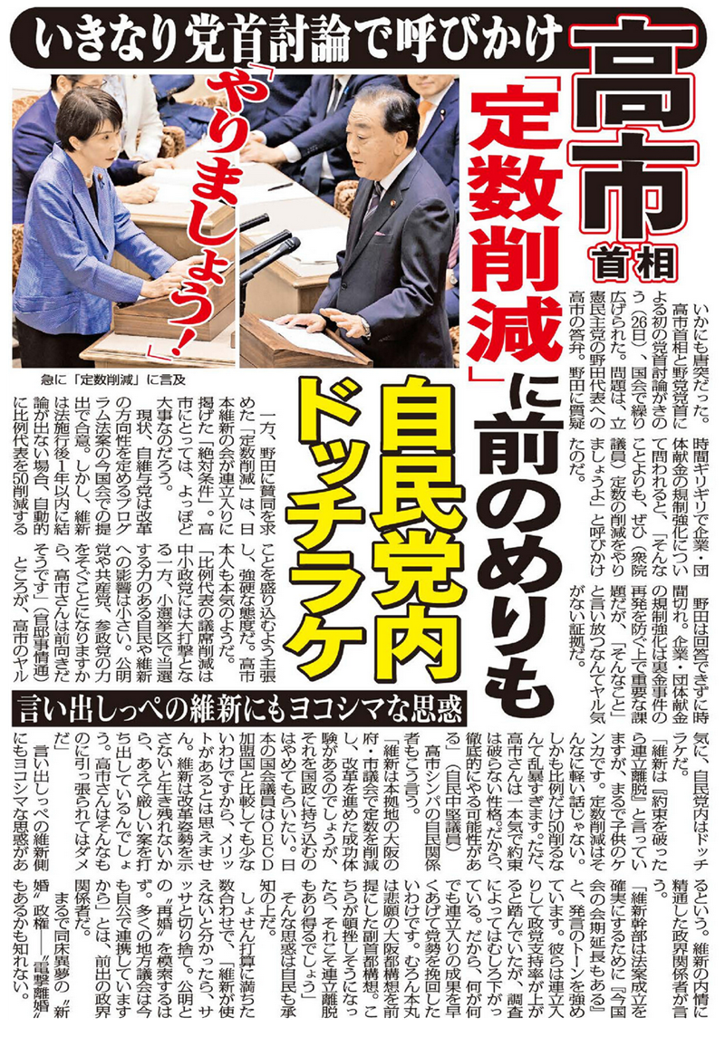 一方、野田氏に賛同を求めた「定数削減」は、日本維新の会が連立入りに掲げた「絶対条件」。高市首相にとっては、よっぽど大事なのだろう。