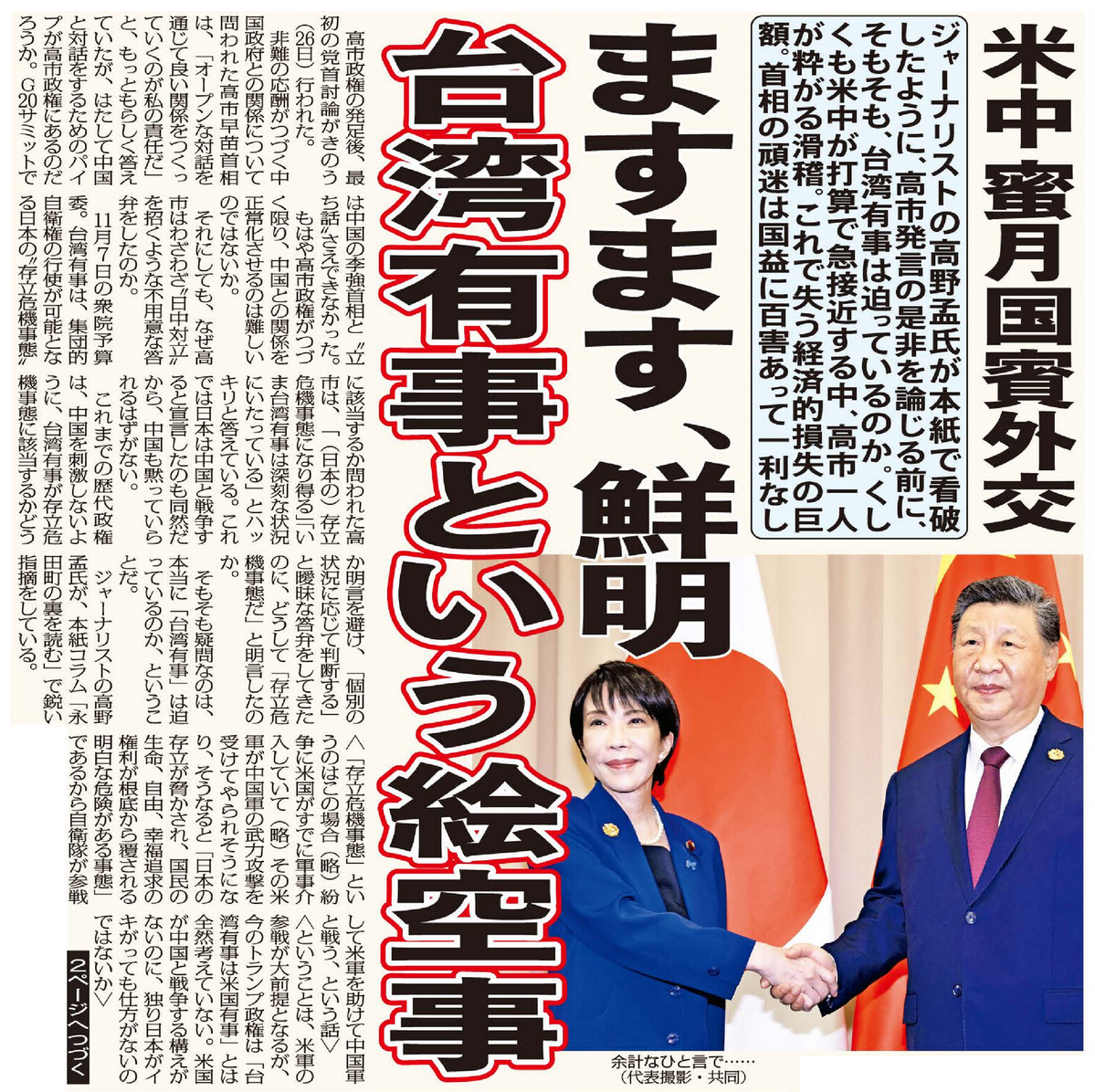 ジャーナリストの高野孟氏が日刊ゲンダイで看破したように、高市発言の是非を論じる前に、そもそも、台湾有事は迫っているのか。くしくも米中が打算で急接近する中、高市一人が粋がる滑稽。これで失う経済的損失の巨額。首相の頑迷は国益に百害あって一利なし。