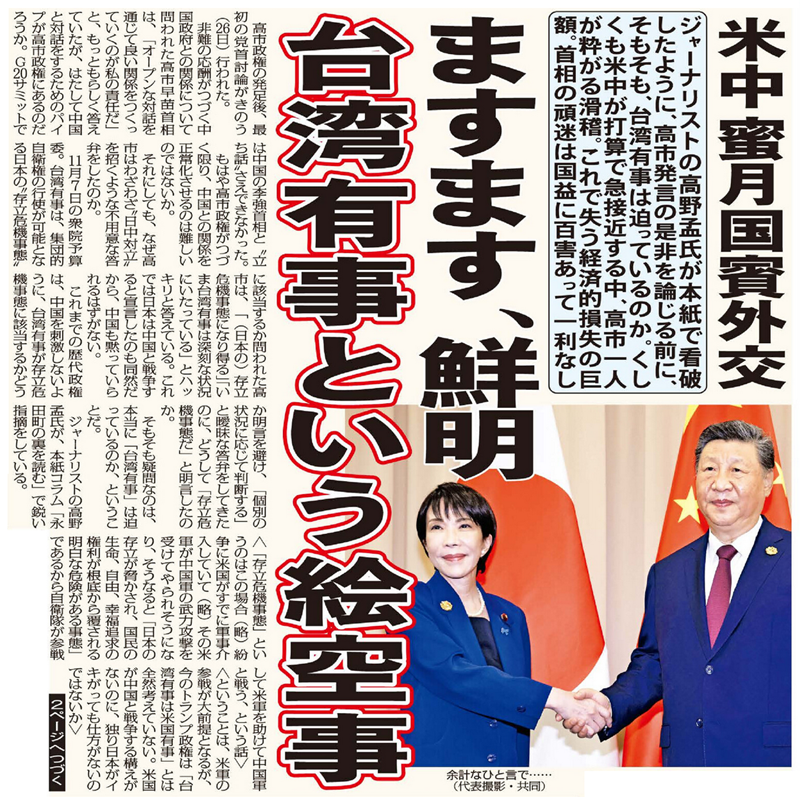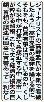 「台湾有事」など切迫もしていないのに、首相の余計な一言で国益が損なわれている。