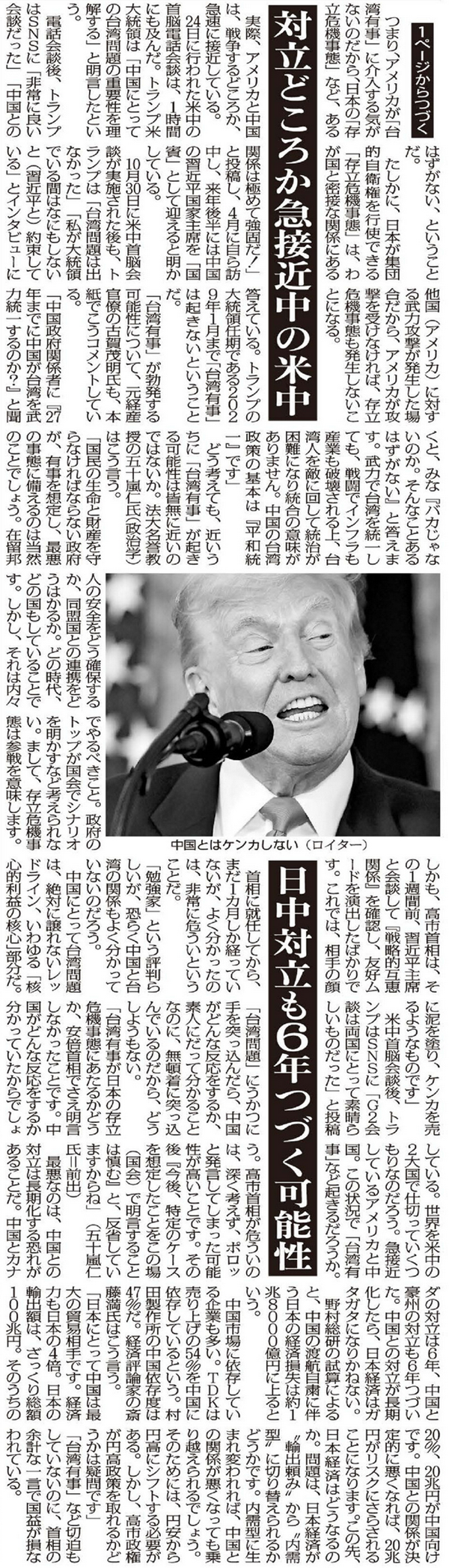 <ということは、米軍の参戦が大前提となるが、今のトランプ政権は「台湾有事は米国有事」とは全然考えていない。米国が中国と戦争する構えがないのに、独り日本がイキがっても仕方がないのではないか>