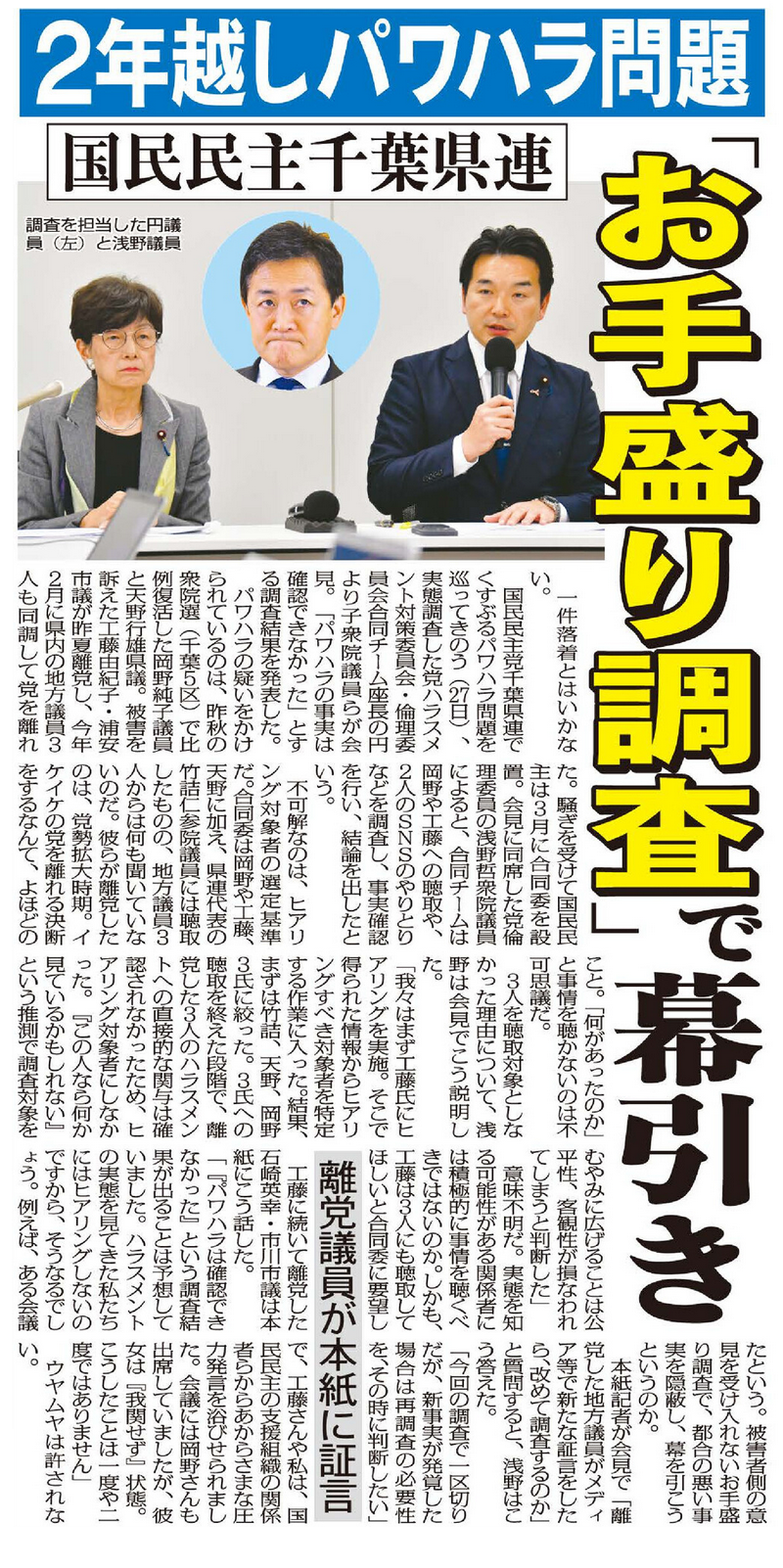パワハラの疑いをかけられているのは、昨秋の衆院選(千葉5区)で比例復活した岡野純子議員と天野行雄県議。被害を訴えた工藤由紀子・浦安市議が昨夏離党し、今年2月に県内の地方議員3人も同調して党を離れた。騒ぎを受けて国民民主は3月に合同委を設置。会見に同席した党倫理委員の浅野哲衆院議員によると、合同チームは岡野議員や工藤議員への聴取や、2人のSNSのやりとりなどを調査し、事実確認を行い、結論を出したという。