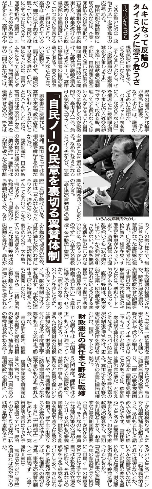 直前に野田は、政党支部が企業・団体献金を受け取れないようにする国民民主・公明提出の法案への賛意を表明。「この国会で通したい」と高市に揺さぶりをかけ、せっかく「政治とカネ」追及のバトンを渡したのに、そのチャンスを玉木はフイに。献金規制にはひと言も触れず、「年収の壁」引き上げの持論をつらつらと展開したのだ。