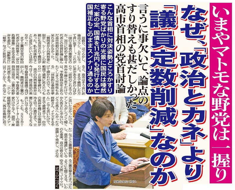 定数削減は、日本維新の会が掲げた連立合意の「絶対条件」。維新側は「約束を破ったら連立離脱」と迫り続けている。高市は「そんなんなったらワタシ、辞めなアカンやん」てなわけで「なぜ1割なのか」「あまりにも拙速だ」と自民党内から異論が出ようが、なりふり構わず。保身のため、打算に満ちた数合わせにしがみつき、定数削減に前のめりのポーズを取っているに過ぎない。