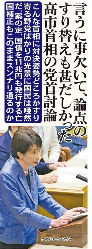 言うに事欠いて、論点のすり替えも甚だしかった高市首相の党首討論。こんな首相に、対決姿勢どころかすり寄る野党ばかりの光景に国民は唖然だ。案の定、国債を11兆円も発行する亡国補正もこのままスンナリ通るのか。