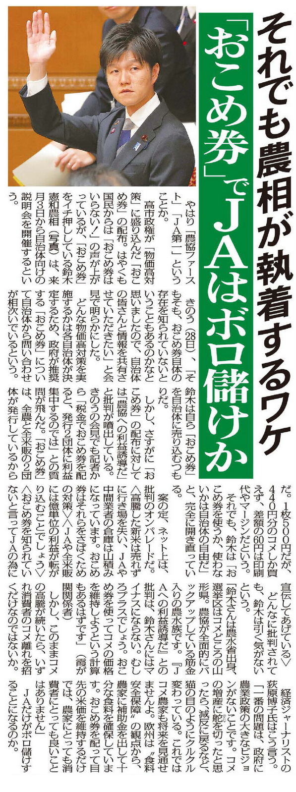 しかし、さすがに「おこめ券」の配布に対しては「農協への利益誘導だ」と批判が噴出している。28日の会見でも記者から「税金でおこめ券を配ると、発行2団体に利益集中するのでは」との質問が飛んだ。「おこめ券」は、全農と全米販の2団体が発行しているからだ。1枚500円だが、440円分のコメしか買えず、差額の60円は印刷代やマージンだという。