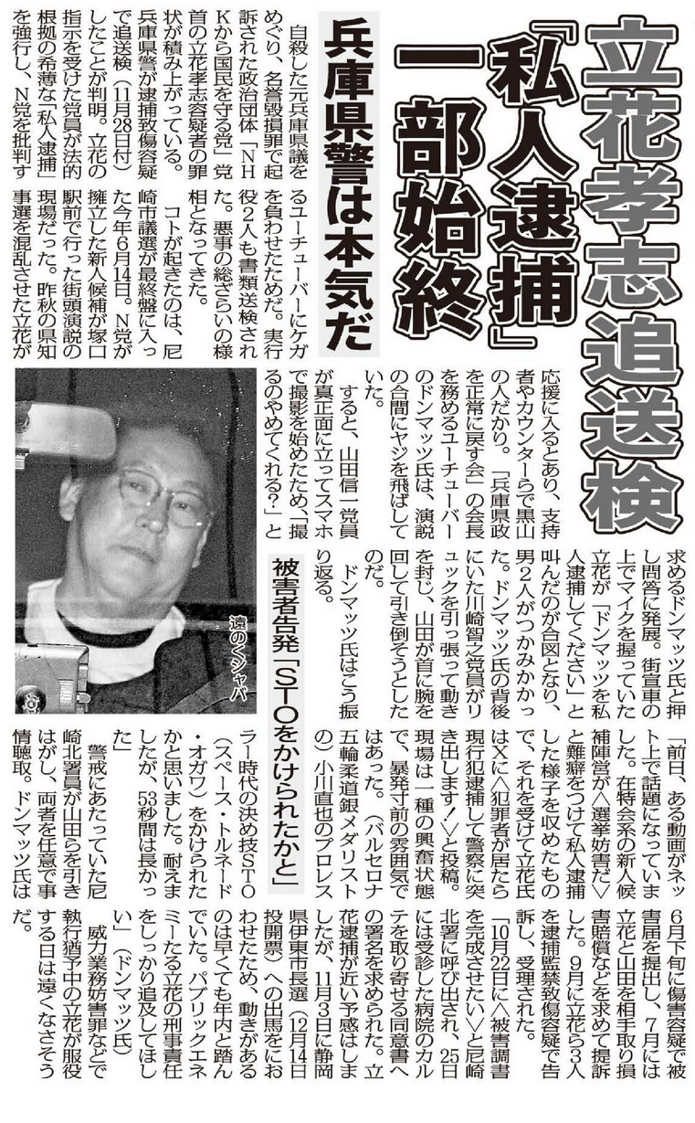 自殺した元兵庫県議をめぐり、名誉毀損罪で起訴された政治団体「NHKから国民を守る党」党首の立花孝志容疑者の罪状が積み上がっている。兵庫県警が逮捕致傷容疑で追送検(11月28日付)したことが判明。立花容疑者の指示を受けた党員が法的根拠の希薄な「私人逮捕」を強行し、N党を批判するユーチューバーにケガを負わせたためだ。実行役2人も書類送検された。悪事の総ざらいの様相となってきた。