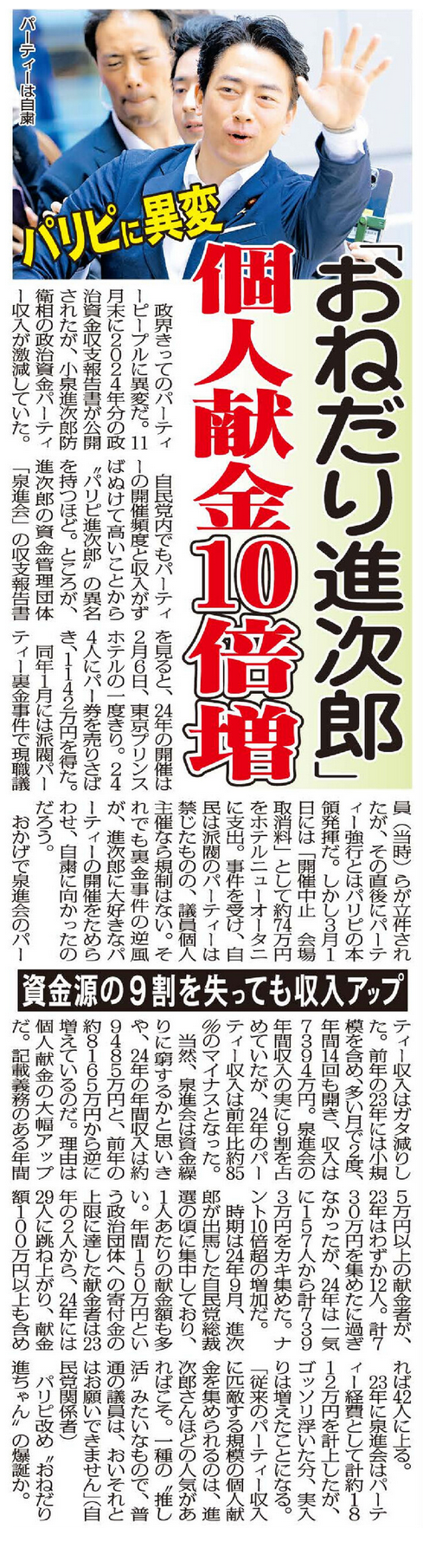 “パリピ進次郎”改め“おねだり進ちゃん”爆誕? パーティー収入85%減も、個人献金10倍増で収入アップ