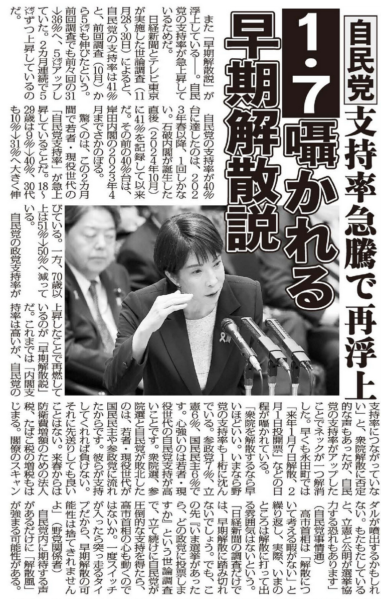 「日経新聞の調査だけでは、早期解散に踏み切れないでしょう。でも、この先『いま選挙があったら、どの政党に投票しますか』という世論調査で、立て続けに自民党が圧倒的な支持を得たら、高市首相の心も動くのではないか。一度スイッチが入ったら突っ走るタイプだから、早期解散の可能性は捨てきれませんよ」(野党関係者)