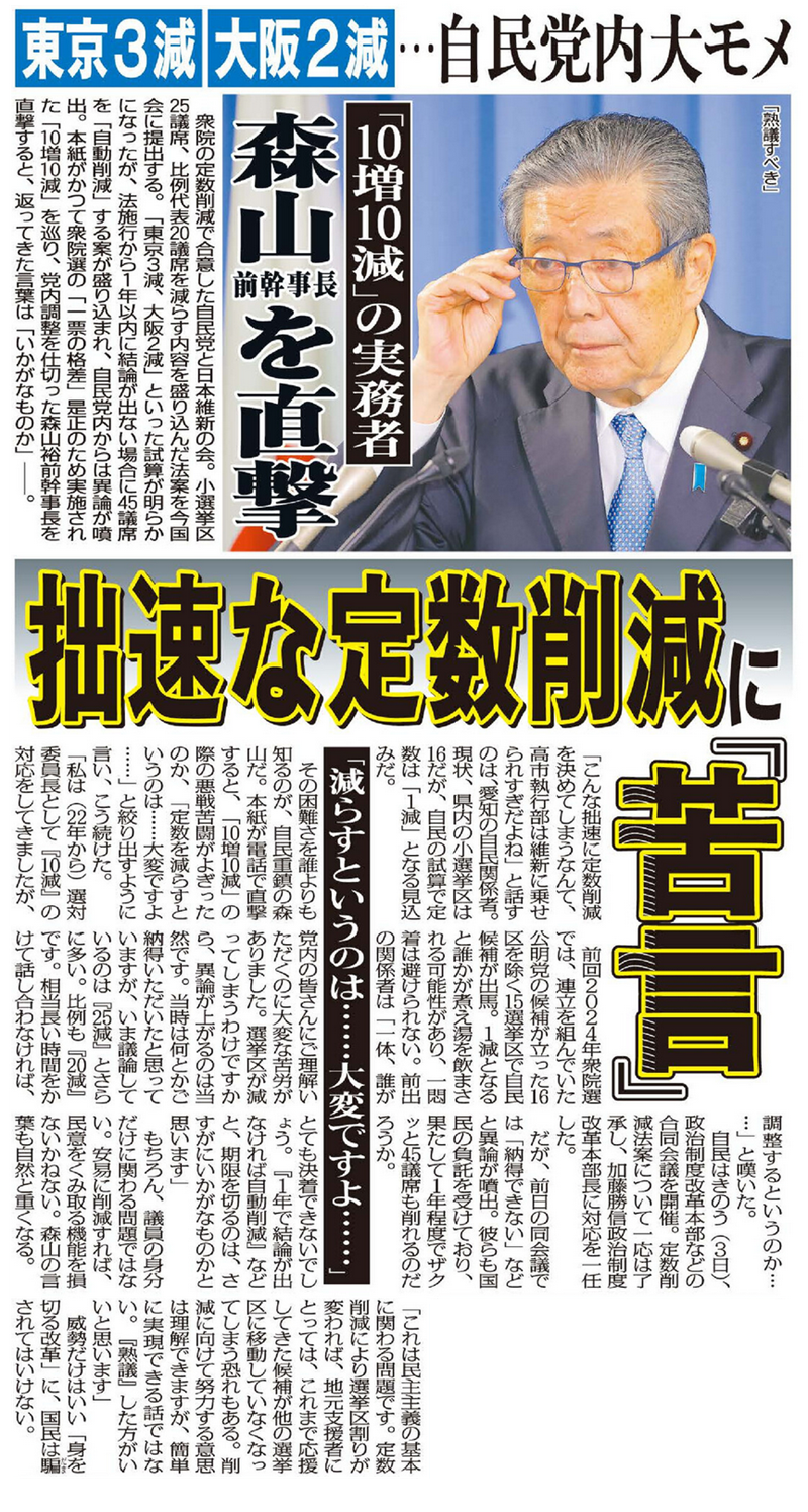 衆院の定数削減で合意した自民党と日本維新の会。小選挙区25議席、比例代表20議席を減らす内容を盛り込んだ法案を今国会に提出する。「東京3減、大阪2減」といった試算が明らかになったが、法施行から1年以内に結論が出ない場合に45議席を「自動削減」する案が盛り込まれ、自民党内からは異論が噴出。日刊ゲンダイがかつて衆院選の「一票の格差」是正のため実施された「10増10減」を巡り、党内調整を仕切った森山裕前幹事長を直撃すると、返ってきた言葉は「いかがなものか」──。
