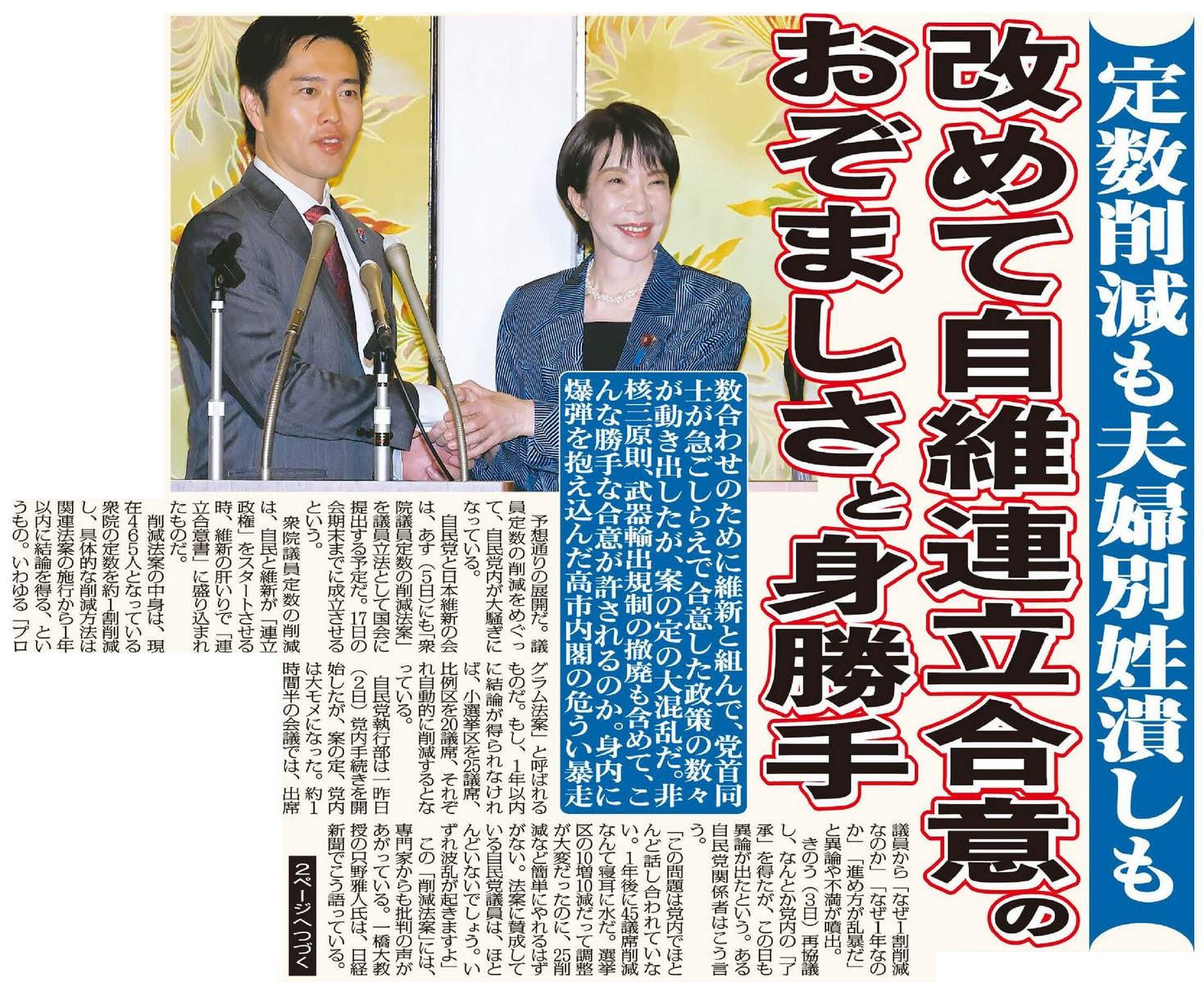 定数削減も夫婦別姓潰しも…改めて自維連立政権合意のおぞましさと身勝手