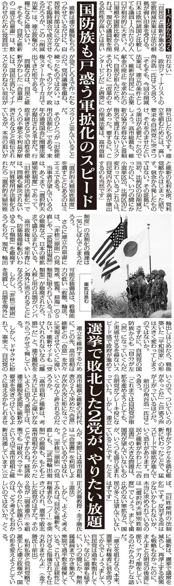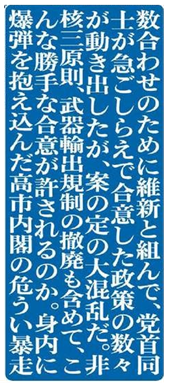 数合わせのために維新と組んで、党首同士が急ごしらえで合意した政策の数々が動き出したが、案の定の大混乱だ。非核三原則、武器輸出規制の撤廃も含めて、こんな勝手な合意が許されるのか。身内に爆弾を抱え込んだ高市内閣の危うい暴走。