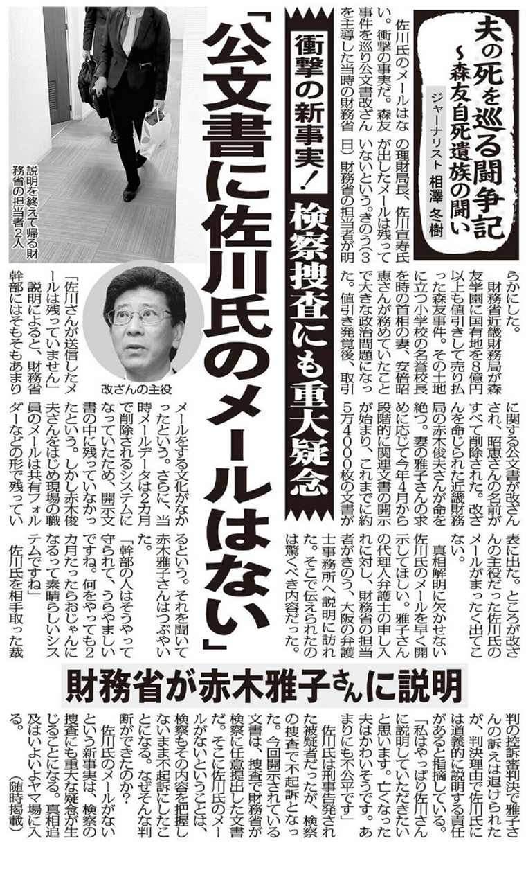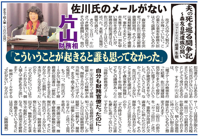 佐川氏のメールが残っていない重大事実…片山財務相まるで他人事「こういうことが起きると誰も思ってなかった」 森友遺族・夫の死を巡る闘争記