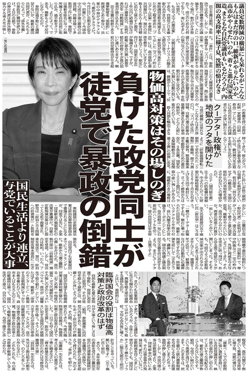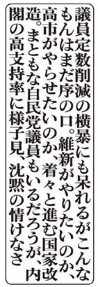 自民も維新も夏の参院選で惨敗し、民意に否定された政党だ。それが徒党を組んで暴政とは、倒錯としか言いようがない。