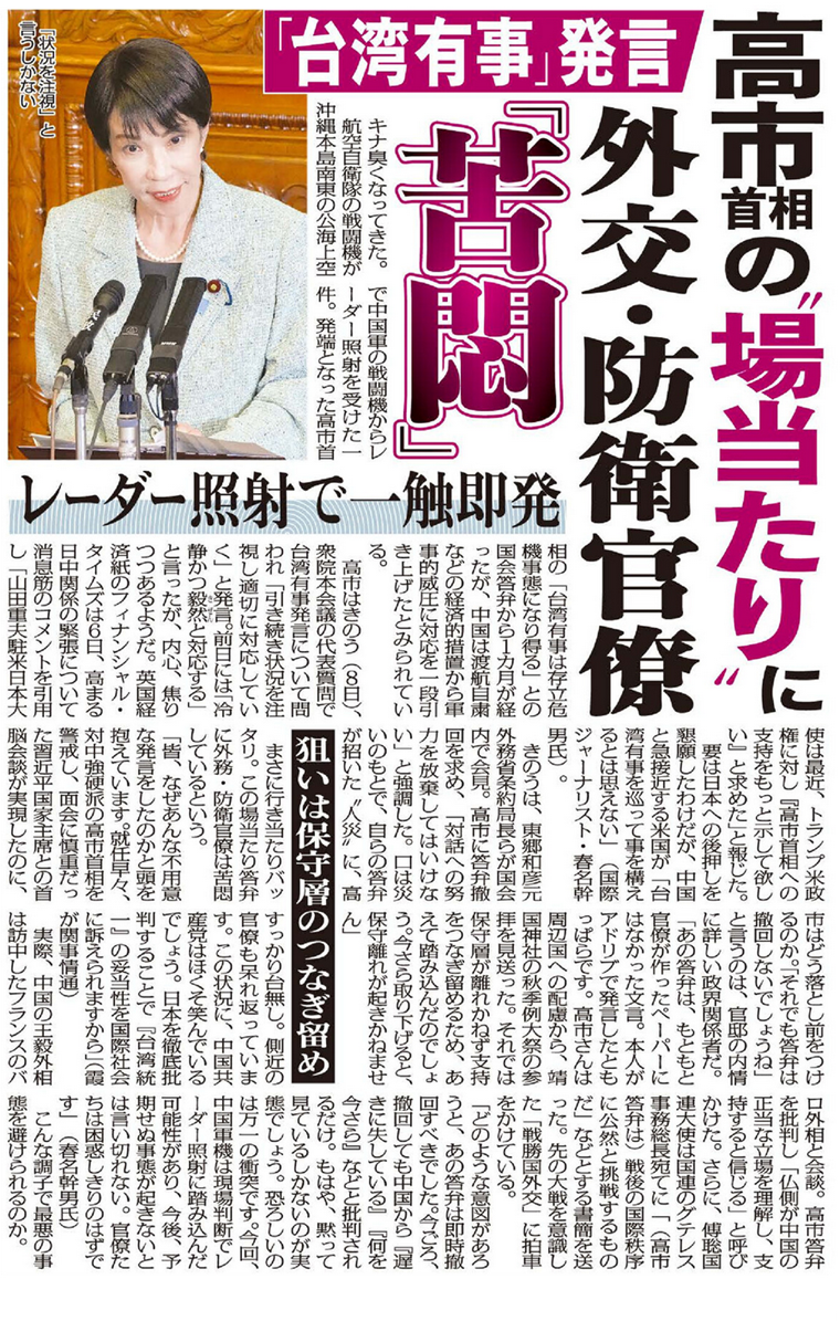 <■566行くらい→右の▽クリックで次のコメントにジャンプ可> 今更「中国側も日本機のレーダーを感知していた」と言われてもねえ。 なら何故最初から言わなかったのか? 中国側の苦し紛れの嘘はもう聞き飽きた。中国、訓練通知の音声公開「日本のレーダーも感知」 小泉防衛相「事前通報認識せず」 2025/12/10 7:23 https://www.sankei.com/article/20251210-XHMACRGZONO5NP7X2MJPQSNYYM/ 中国軍は9日、中国軍機による自衛隊機へのレーダー照射を巡り、中国軍が空母「遼寧」での艦載機の発着艦訓練について自衛隊側に事前通知したとする音声データをインターネットで公開した。 「中国側も日本機のレーダーを感知していた」 と主張し、自衛隊機が訓練区域に入り中国軍機から50キロに満たない距離にまで接近したとしている。 中国軍は6日に沖縄周辺の太平洋で実施した訓練について、現場付近にいた海上自衛隊の護衛艦に訓練区域などを事前に通知したと強調。 自衛隊機が 「訓練区域に進入し、自ら中国側のレーダー捜索範囲に入った」 とし、中国軍機も自衛隊機のレーダーを感知したと主張した。 小泉進次郎防衛相は9日の記者会見で 「遼寧の艦載機などの訓練海空域に関する航空情報(ノータム)や航行警報が、事前に通報されていたとは認識していない」 と述べた。(共同) 中露両軍の爆撃機が日本周辺を共同飛行 高市首相答弁への軍事圧力に露も同調か 2025/12/10 0:40 https://www.sankei.com/article/20251210-FBO3MVESM5PW3AKZVYH3LA2S7M/ 防衛省統合幕僚監部は9日、中国軍とロシア軍の爆撃機が同日、日本周辺を共同飛行したと発表した。 日本周辺海域では中国軍の空母「遼寧」が航行しており、中国空母と同時に中露爆撃機が展開するのは初めて。 両軍機は四国沖南方を飛行しており、これも中露の共同飛行としては初めてだという。 中国政府は高市早苗首相が11月に行った台湾有事を巡る国会答弁に反発。 今月6日には沖縄本島南東の公海上空で、中国海軍の空母から発艦した戦闘機が自衛隊機に2回に渡ってレーダー照射したと発表した。 今回の中露爆撃機による共同飛行も日本に軍事的圧力を加える狙いがあったとみられる。 共同飛行を行ったのは、中国軍のH6爆撃機2機とロシア軍のTu95爆撃機2機。 両軍機は東シナ海で合流し、宮古海峡上空を通過して太平洋上空に進出したところ北東に針路を変え、四国沖まで展開。 同じルートを引き返し、それぞれの基地に帰還したとみられる。 これに対し、航空自衛隊南西航空方面隊などに所属する戦闘機が緊急発進(スクランブル)した。 爆撃機の領空侵犯はなかったという。 統幕によると、中露の爆撃機が日本周辺で共同飛行するのは昨年11月以来9回目。 両軍機は令和元年7月から断続的に共同飛行を行い、中露の連携を誇示している。 「日本のレーダーも感知」中国メディア報道 空母の訓練は事前に現場で通告したと主張 2025/12/9 23:29 https://www.sankei.com/article/20251209-2ROHOV63ZNPZ3DOSIT42OU2L3I/ 中国国営中央テレビ系の交流サイト(SNS)アカウントは9日、中国軍機による自衛隊機へのレーダー照射を巡り 「中国側も日本機のレーダーを感知していた」 と報じた。 中国の空母「遼寧」での発着艦訓練について事前に現場レベルで通告していたとした上で、自衛隊機が訓練区域に入り中国軍機の約50キロの距離にまで接近したとしている。 中国外務省の郭嘉昆副報道局長は9日の記者会見で 「戦闘機の飛行訓練中に、捜索のレーダーを作動させるのは飛行の安全確保のための正常な運用だ」 と主張。 中国の訓練は国際法と国際慣例に合致し、責められる筋合いはないと強調した。 報道によると、中国軍は6日、訓練時間や区域に関し自衛隊の護衛艦に無線で通知。 自衛隊機が 「悪意を持って訓練区域に進入した」 などと主張した。 現場での自衛隊側との無線のやり取りとみられる音声データも公開した。(共同) 「極めて遺憾」「冷静かつ毅然と」「中国の主張事実に反する」 レーダー照射巡り関係閣僚答弁 2025/12/9 19:34 https://www.sankei.com/article/20251209-A4POF5QFOFJDRO3U3HP3NCQMRI/ 9日の衆院予算委員会では、中国軍機による自衛隊機へのレーダー照射を巡り、関係閣僚が答弁に立った。 中国側の行為に対しては 「極めて遺憾だ」(茂木敏充外相) などと厳しい声が上がった一方、威圧を強める中国に冷静な対応を取る考えも示した。 中国側の事実と異なる発信に対しては、日本政府として反論していく姿勢も重ねて強調した。 「事前に通報されていたとは認識していない」。 小泉進次郎防衛相は予算委で、艦載機などの訓練海空域を事前に公表していたとする中国側の主張を真っ向から否定した。 戦闘機のレーダーはミサイルなどの発射に向けた火器管制や周辺の捜索などに使われ、照射の目的がどちらなのか判断は難しいとされる。 今回の照射は長時間に渡り断続的に行われており、小泉氏 「通常、自衛隊で行わないアンプロフェッショナルな行為だ」 と語気を強めた。 一方、小泉氏は 「法の支配に基づく秩序を重視し、冷静かつ毅然