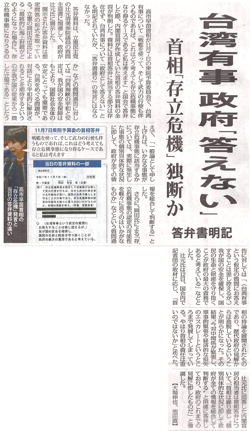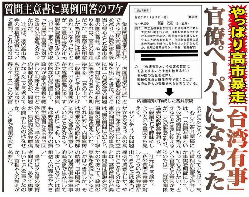 集団的自衛権を行使できる「存立危機事態」を巡り、台湾有事も該当し得るとした高市首相の国会答弁。やっぱりあれは、高市首相の暴走だった。事務方が用意した答弁原稿には記載されていなかったことが、立憲民主党の辻元清美参院議員が12日までに受け取った質問主意書に対する政府の回答で分かったのだ。