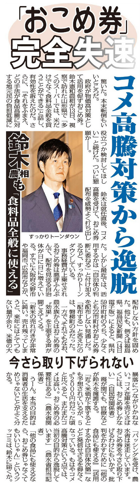 鈴木農相は就任直後、コメ高騰を受けて、おこめ券配布を威勢よく打ち出した。しかし最近では、活用するかは「自治体の判断に委ねる」と付け加えるなど、すっかりトーンダウンしている。