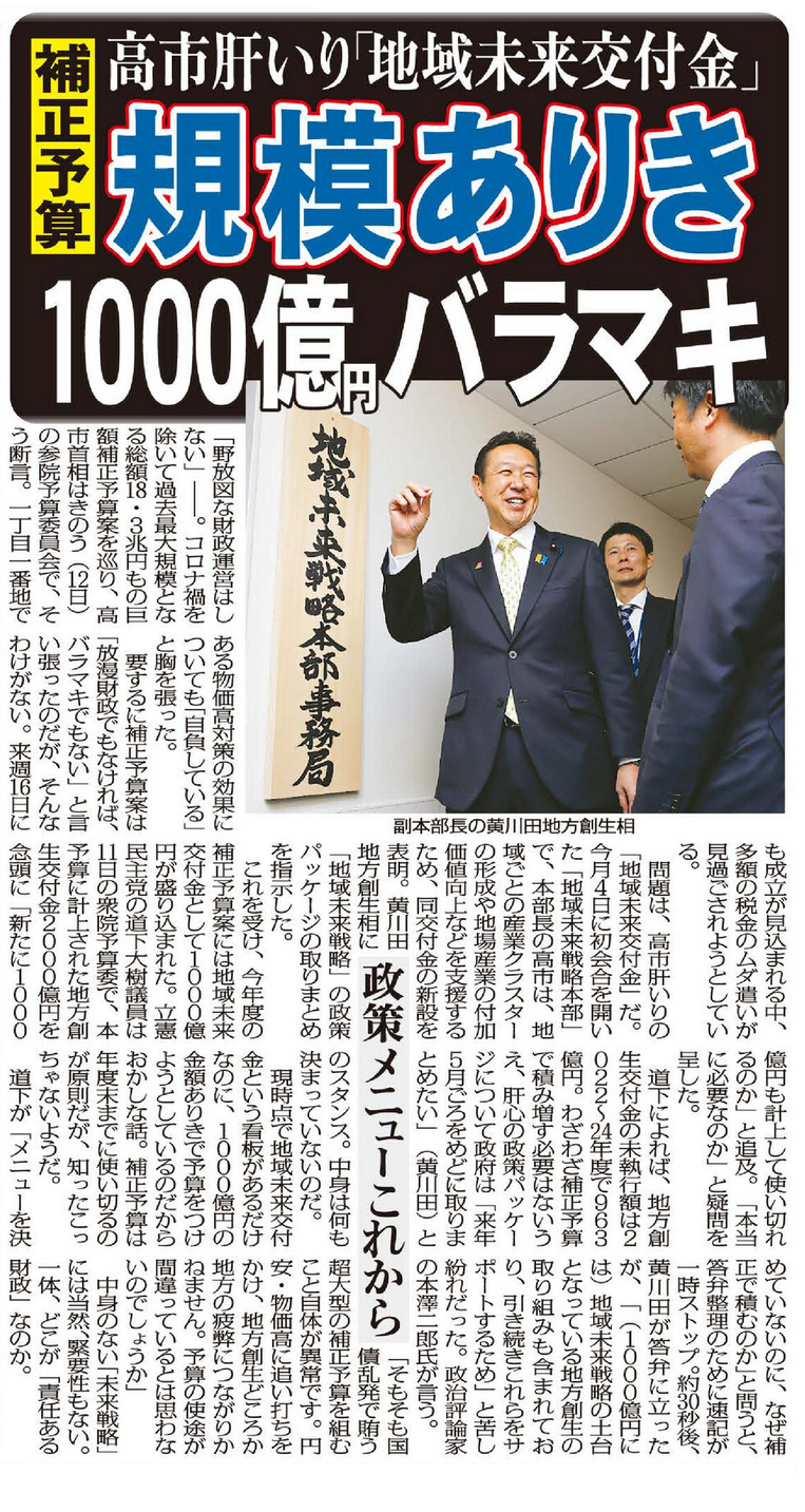 道下議員が「メニューを決めていないのに、なぜ補正で積むのか」と問うと、答弁整理のために速記が一時ストップ。約30秒後、黄川田大臣が答弁に立ったが、「(1000億円には)地域未来戦略の土台となっている地方創生の取り組みも含まれており、引き続きこれらをサポートするため」と苦し紛れだった。政治評論家の本澤二郎氏が言う。