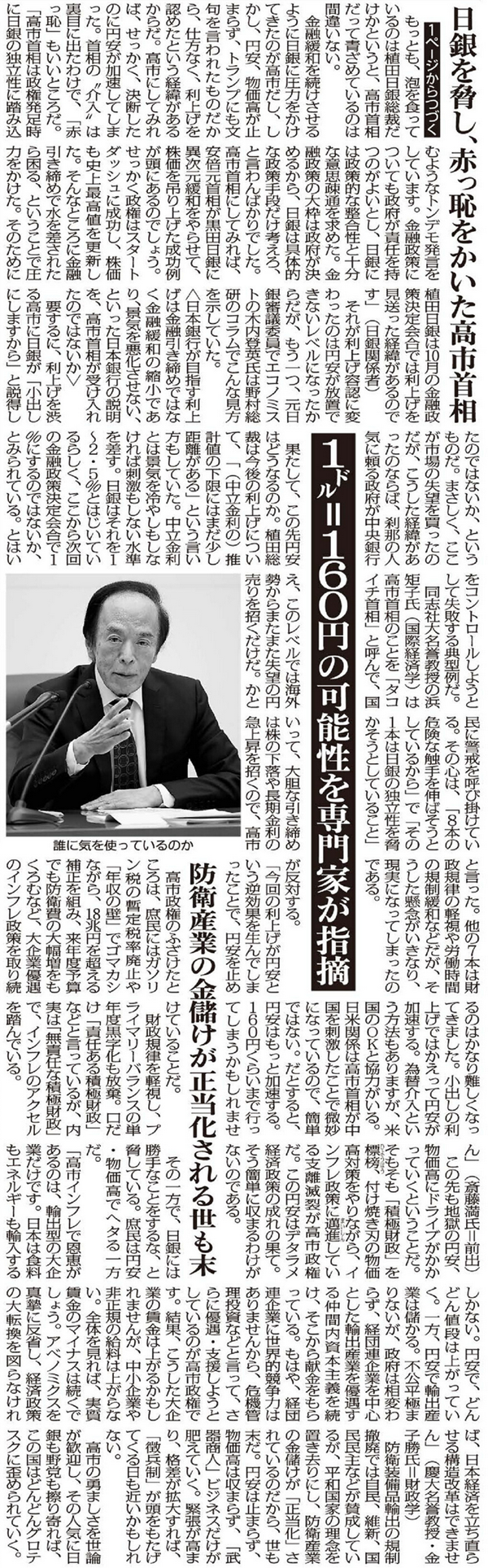 同志社大名誉教授の浜矩子氏(国際経済学)は高市首相のことを「タコイチ首相」と呼んで、国民に警戒を呼び掛けている。その心は、「8本の危険な触手を伸ばそうとしているから」で「その1本は日銀の独立性を脅かそうとしていること」と言った。他の7本は財政規律の軽視や労働時間の規制緩和などだが、そうした懸念がいきなり、現実になってしまったのである。