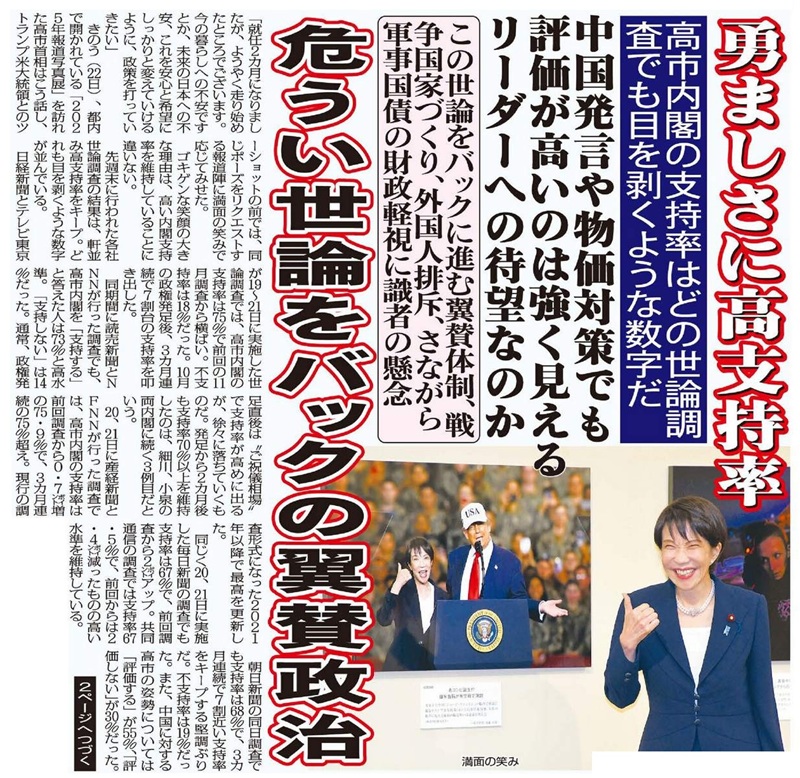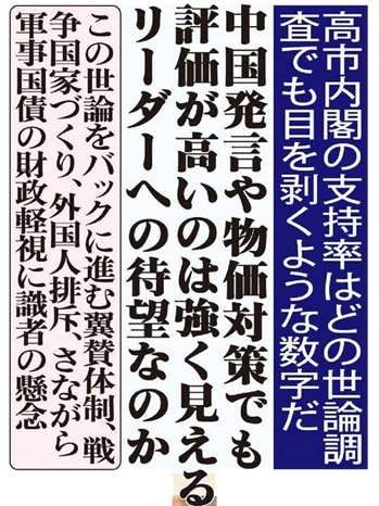 高市内閣の支持率はどの世論調査でも目を剥くような数字だ。中国発言や物価対策でも評価が高いのは強く見えるリーダーへの待望なのか。この世論をバックに進む翼賛体制、戦争国家づくり、外国人排斥、さながら軍事国債の財政軽視に識者の懸念。