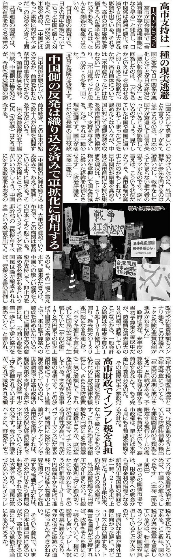 高市が国会答弁で「台湾有事が存立危機事態になり得る」と発言し、日中関係は急速に悪化。経済や文化交流面に大きな影響が出ている。それでも、高市の対中姿勢を評価する人が過半数を占めたのである。これは、なんとも剣呑な現象ではないか。