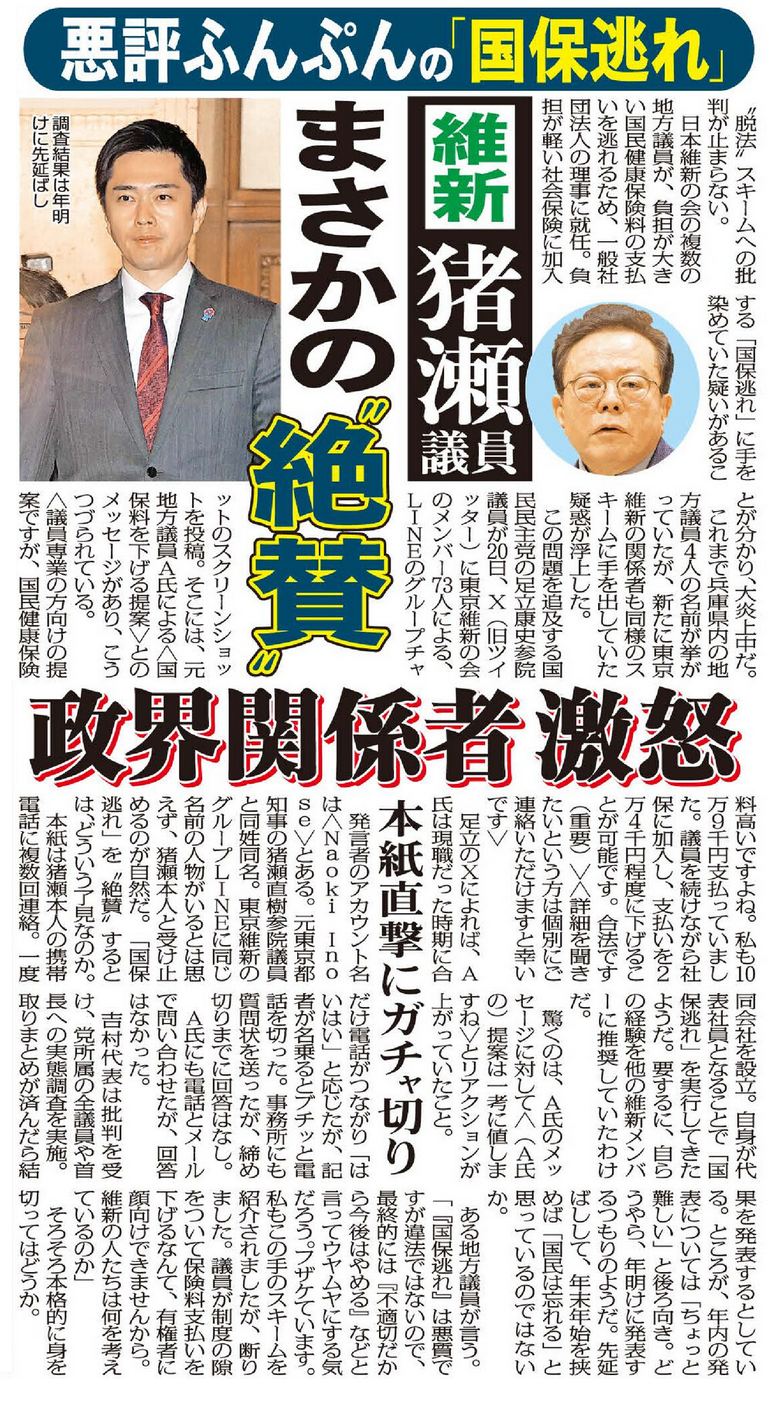 発言者のアカウント名は〈Naoki Inose〉とある。元東京都知事の猪瀬直樹参院議員と同姓同名。東京維新のグループLINEに同じ名前の人物がいるとは思えず、猪瀬氏本人と受け止めるのが自然だ。「国保逃れ」を“絶賛”するとは、どういう了見なのか。