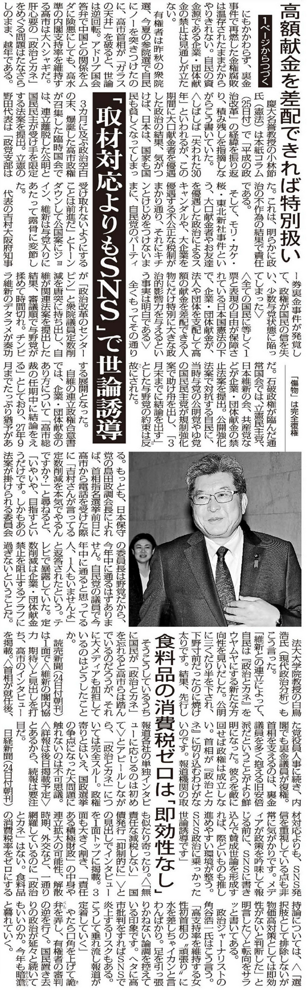 日経新聞(24日付朝刊)も似たり寄ったり。〈「無責任な減税しない」 国債発行「抑制的に」〉との見出しでインタビューを1面トップに掲載。3面も大きく割き、「責任ある積極財政」の中身や連立拡大の可能性、解散時期、外交など、一通り網羅しているのに「政治とカネ」はない。食料品の消費税率をゼロにする持論については、〈「選択肢として排除しないが物価高対策としては即効性がないと判断した」と明言した〉と転向をサラッと書いてある。