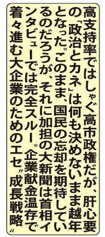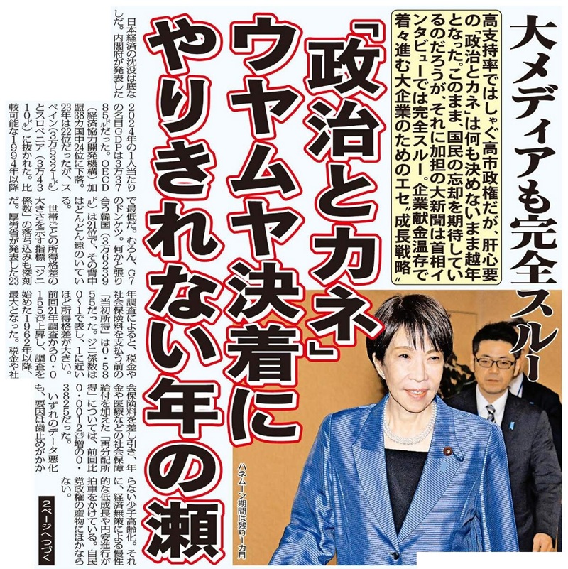 「高支持率ではしゃぐ高市政権だが、肝心要の「政治とカネ」は何も決めないまま越年となった。このまま、国民の忘却を期待しているのだろうが、それに加担の大新聞は首相インタビューでは完全スルー。企業献金温存で着々進む大企業のためのエセ”成長戦略。