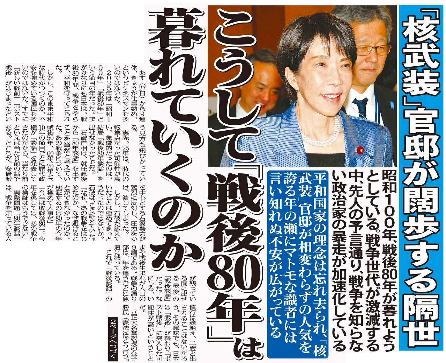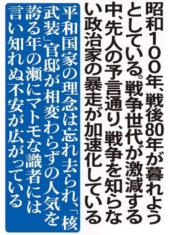 昭和100年、戦後80年が暮れようとしている。戦争世代が激減する中、先人の予言通り、戦争を知らない政治家の暴走が加速化している。平和国家の理念は忘れ去られ、「核武装」官邸が相変わらずの人気を誇る年の瀬にマトモな識者には言い知れぬ不安が広がっている。