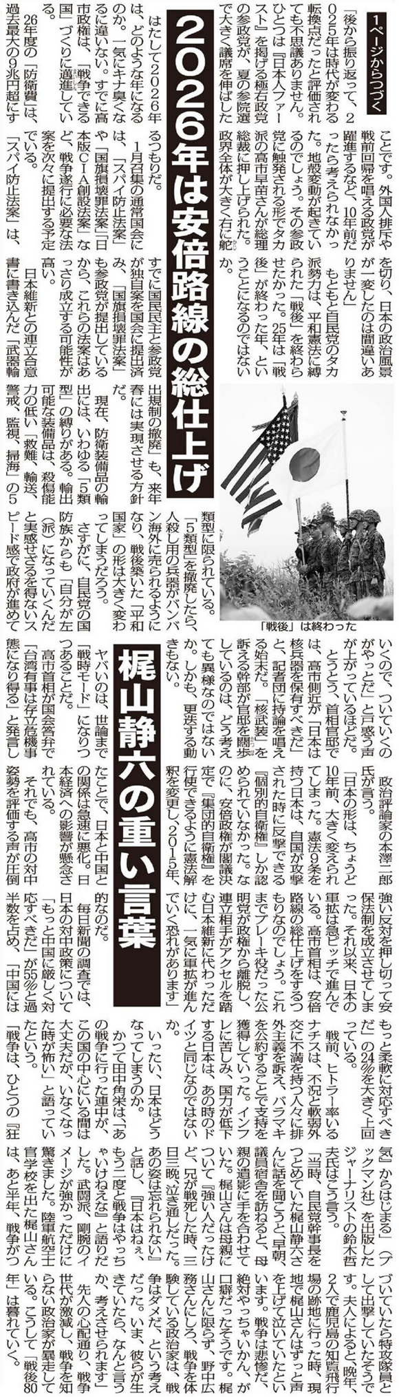 もともと自民党のタカ派勢力は、平和憲法に縛られた「戦後」を終わらせたかった。25年は「戦後」が終わった年、ということになるのではないか。