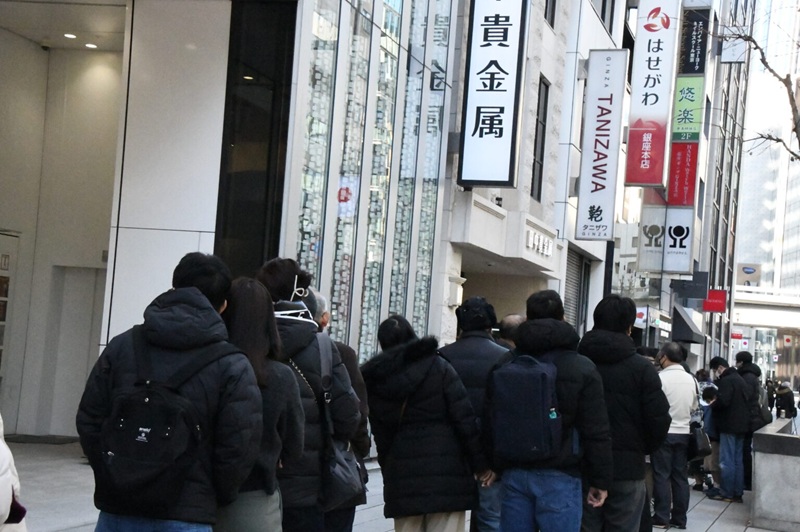 貴金属店前には金を求める人の長蛇の列が。=28日朝、都内 撮影:田中龍作=