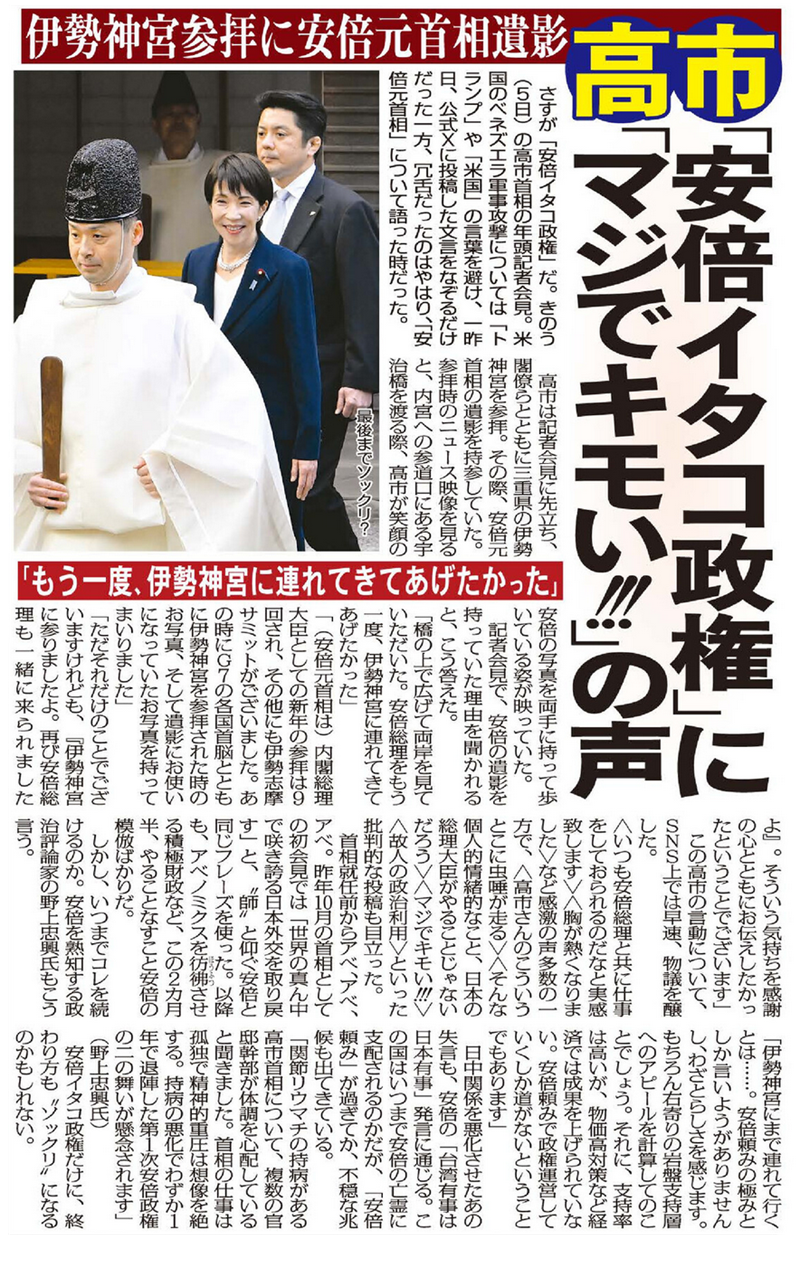 高市“安倍イタコ政権”にSNSでは《マジでキモい!!!》の声も 伊勢神宮参拝に元首相の遺影持参で物議