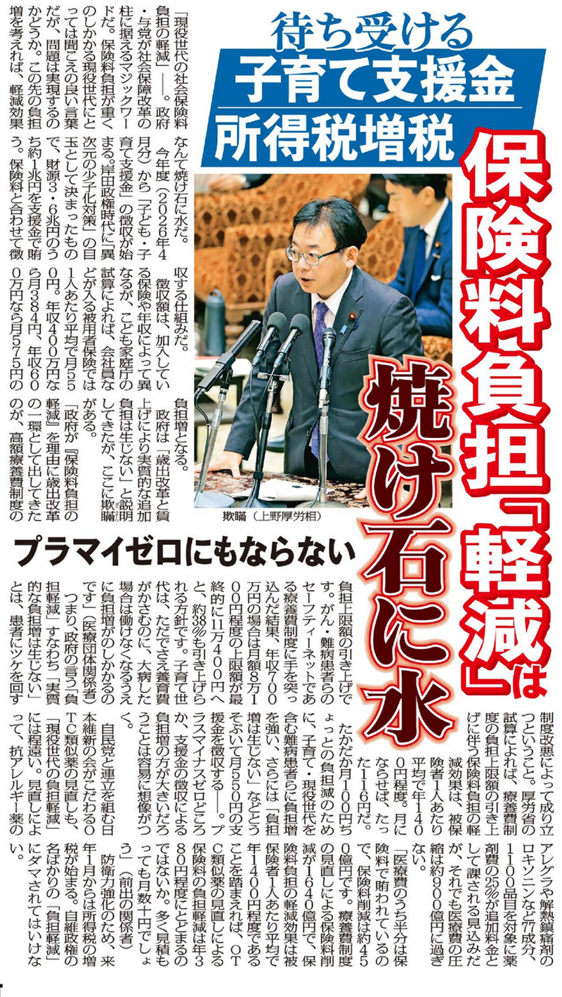 たかだか月100円ちょっとの負担減のために、子育て・現役世代を含む難病患者らに負担増を強い、さらには「負担増は生じない」などとうそぶいて月550円の支援金を徴収する──。プラスマイナスゼロどころか、支援金の徴収による負担増の方が大きいだろうことは容易に想像がつく。