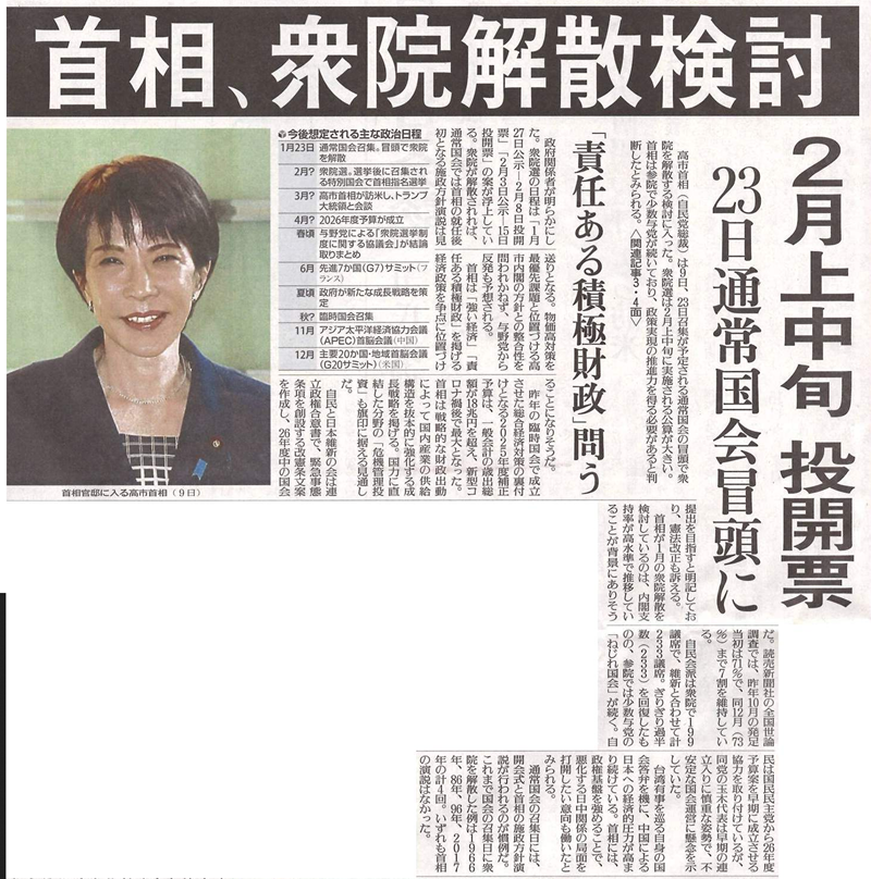 🗞️高市首相が衆院解散を検討、23日通常国会の冒頭に…2月上中旬に投開票の公算https://t.co/4y70OdeMpE