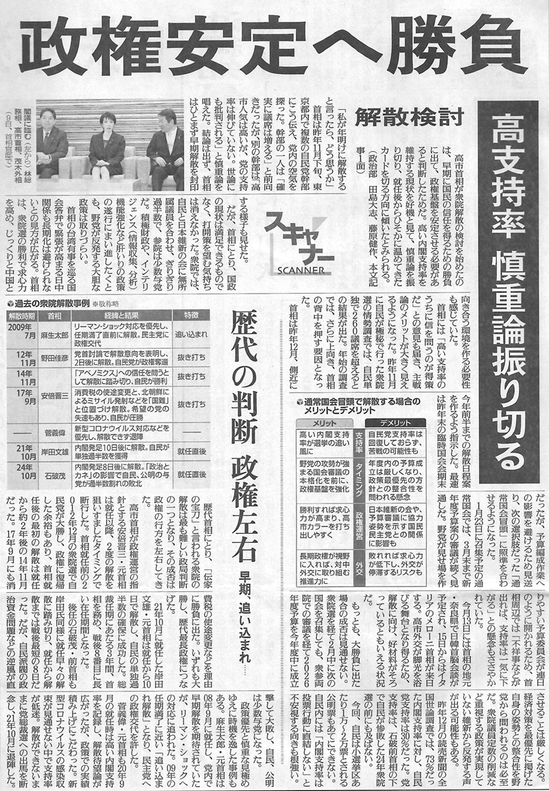 今回、衆院が解散されれば、通常国会では首相の就任後初となる施政方針演説は見送りとなる。物価高対策を最優先課題と位置づける高市内閣の方針との整合性を問われかねず、衆院解散に与野党から反発も予想される。