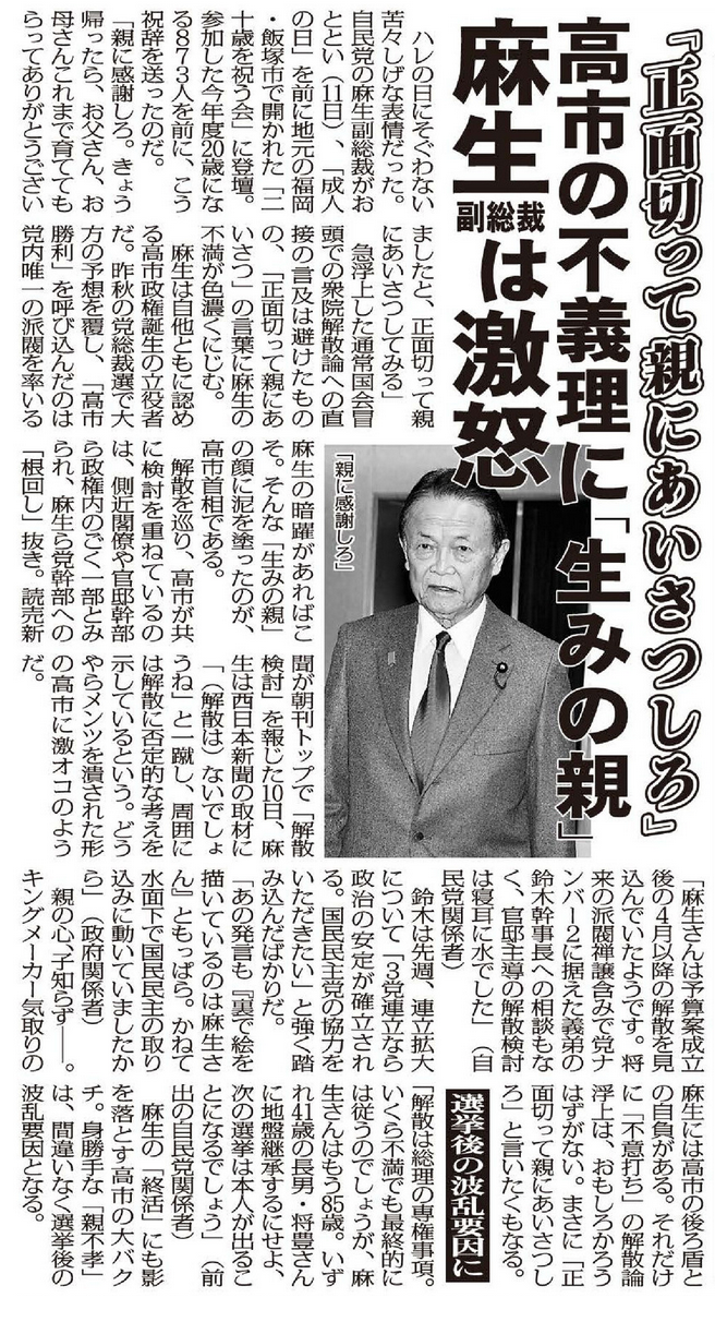 親の心、子知らず――。キングメーカー気取りの麻生氏には高市首相の後ろ盾との自負がある。それだけに「不意打ち」の解散論浮上は、おもしろかろうはずがない。まさに「正面切って親にあいさつしろ」と言いたくもなる。