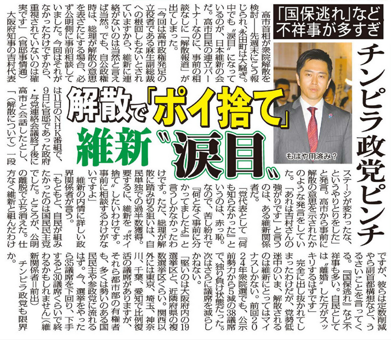 大阪府知事の吉村洋文代表は11日のNHK番組で、9日に官邸であった政府・与党連絡会議終了後に高市と会話したとし、「(解散について)一段ステージが変わったな、というやりとりをした」と発言。高市から事前に解散の意思を示されたかのような発言をしていた。「あれは吉村さんの強がりです」と言うのは、ある維新関係者だ。