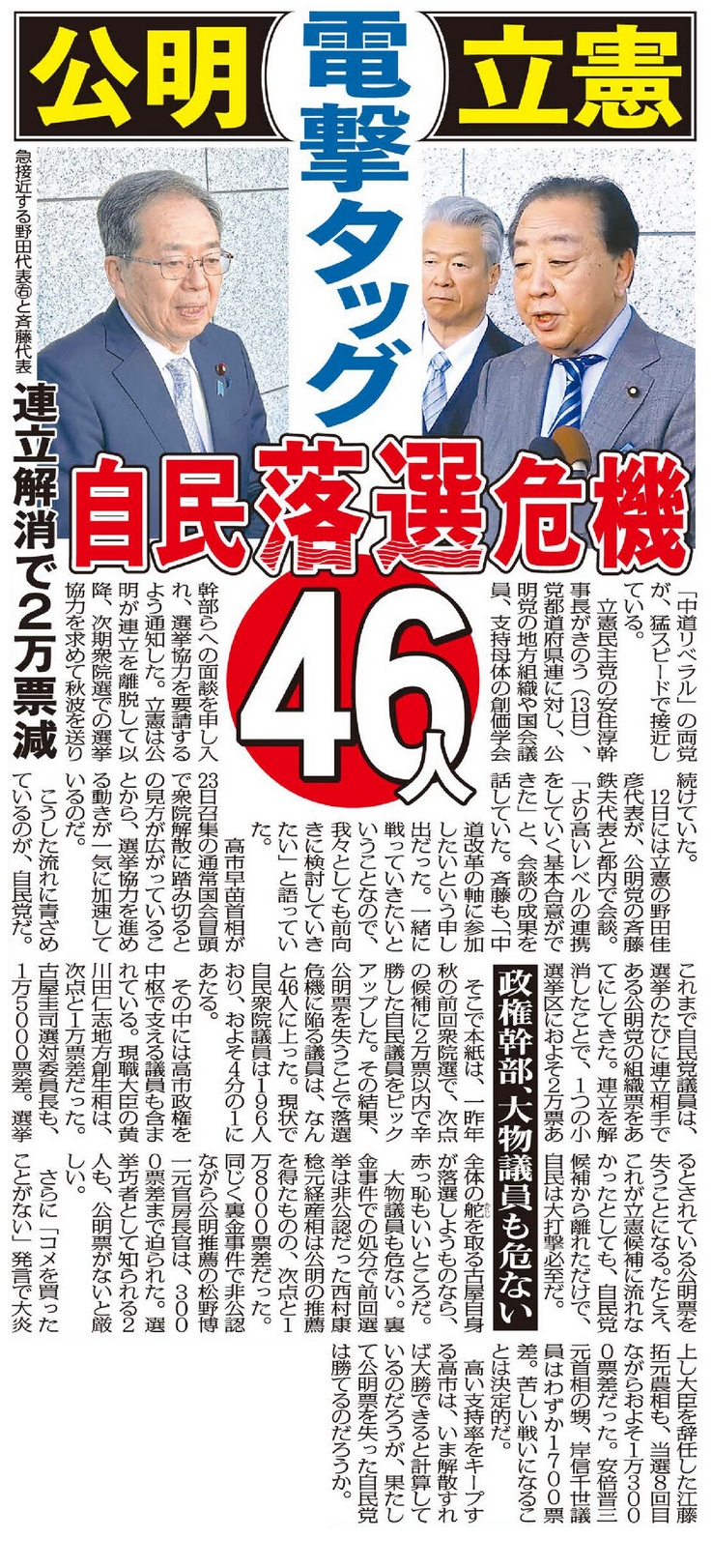 中道リベラルの立憲×公明“電撃タッグ” 次期衆院選で自民候補46人が落選危機