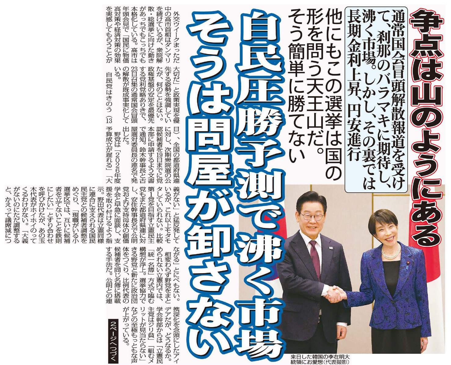通常国会冒頭解散報道を受けて、刹那のバラマキに期待し、沸く市場。しかし、その裏では長期金利上昇、円安進行。他にもこの選挙は国の形を問う天王山だ。そう簡単に勝てない。