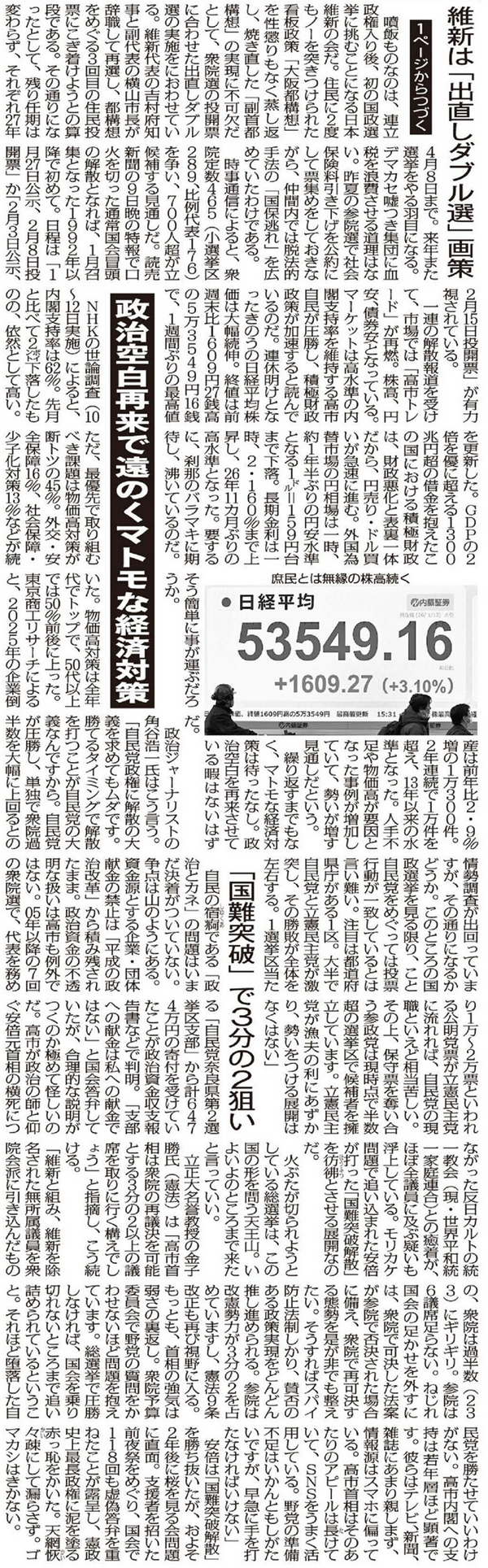一連の解散報道を受けて、市場では「高市トレード」が再燃。株高、円安、債券安となっている。マーケットは高水準の内閣支持率を維持する高市自民が圧勝し、積極財政政策が加速すると読んでいるのだ。連休明けとなったきのうの日経平均株価は大幅続伸。終値は前週末比1609円27銭高の5万3549円16銭で、1週間ぶりの最高値を更新した。GDPの2倍を優に超える1300兆円超の借金を抱えたこの国における積極財政は、財政悪化と表裏一体だから、円売り・ドル買いが急速に進む。外国為替市場の円相場は一時、約1年半ぶりの円安水準となる1ドル=159円台まで下落。長期金利は一時、2.160%まで上昇し、26年11カ月ぶりの高水準となった。要するに、刹那のバラマキに期待し、沸いているのだ。そう簡単に事が運ぶだろうか。