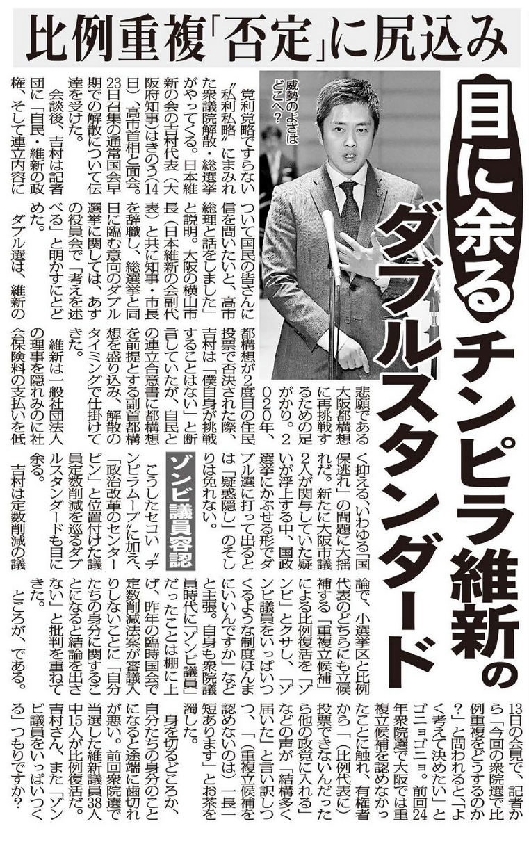 吉村代表は定数削減の議論で、小選挙区と比例代表のどちらにも立候補する「重複立候補」による比例復活を「ゾンビ」とクサし、「ゾンビ議員をいっぱいつくるような制度ほんまにいいんですか」などと主張。自身も衆院議員時代に「ゾンビ議員」だったことは棚に上げ、昨年の臨時国会で定数削減法案が審議入りしないことに「自分たちの身分に関することになると結論を出さない」と批判を重ねてきた。