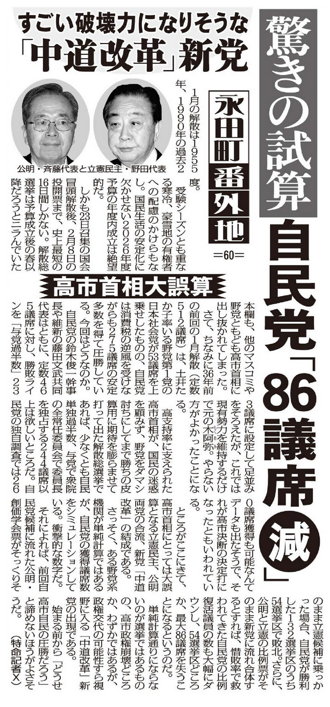 すごい破壊力になりそうな新党「中道改革」自民党86議席減という驚きの試算 永田町番外地