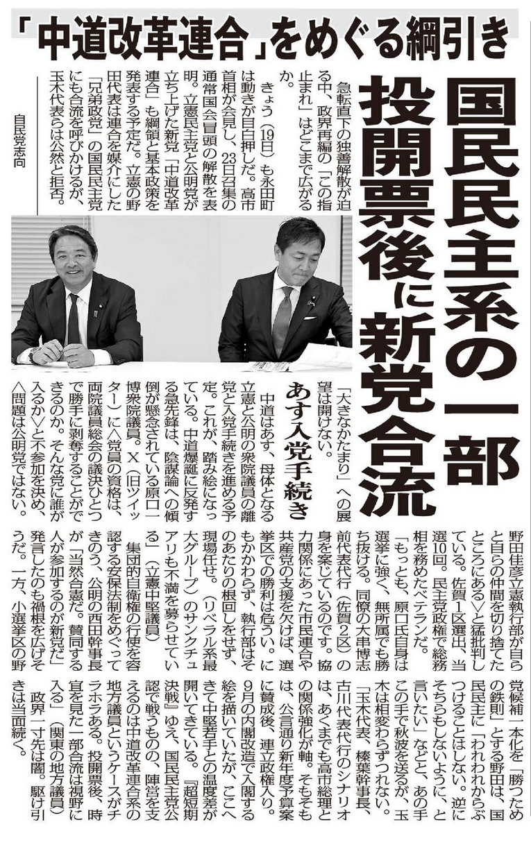 19日も永田町は動きが目白押しだ。高市首相が会見し、23日召集の通常国会冒頭の解散を表明。立憲民主党と公明党が立ち上げた新党「中道改革連合」も綱領と基本政策を発表する予定だ。立憲の野田代表は連合を媒介にした「兄弟政党」の国民民主党にも合流を呼びかけるが、玉木代表らは公然と拒否。「大きなかたまり」への展望は開けない。