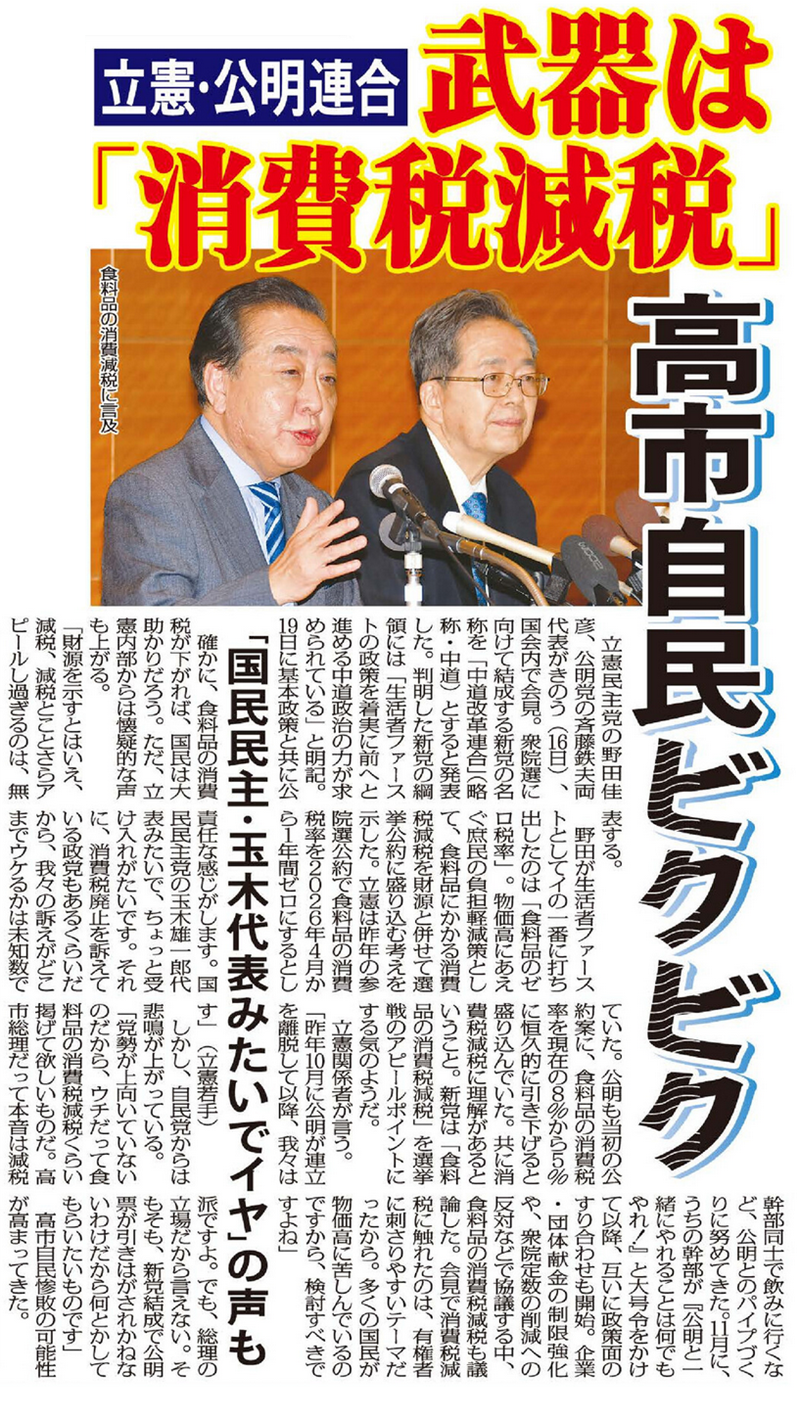 野田氏が生活者ファーストとしてイの一番に打ち出したのは「食料品のゼロ税率」。物価高にあえぐ庶民の負担軽減策として、食料品にかかる消費税減税を財源と併せて選挙公約に盛り込む考えを示した。立憲は昨年の参院選公約で食料品の消費税率を2026年4月から1年間ゼロにするとしていた。公明も当初の公約案に、食料品の消費税率を現在の8%から5%に恒久的に引き下げると盛り込んでいた。共に消費税減税に理解があるということ。新党は「食料品の消費税減税」を選挙戦のアピールポイントにする気のようだ。