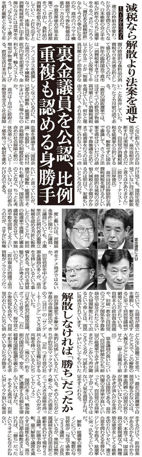 裏金議員の扱いについて、自民党幹部からも「前回の総選挙でみそぎは済ませた」とかいう声が聞こえてくるが、冗談もたいがいにしてもらいたい。最近の国政選挙で自民党が振るわないのは、裏金問題への国民の怒りが消えていないからだ。みそぎが済んだかを決めるのは国民である。高市内閣の支持率が高いといっても、自民党の支持率が上がっているわけではない。人気を過信すれば、足をすくわれる。