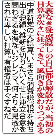 大義なき疑惑隠しの自己都合解散だが、当初の目算が次々に狂ってきて、風向きが変わりつつある。中道新党の大誤算、いまさら消費税減税を持出す泥縄、維新を切りたいくせに連立合意を問わざるを得ないジレンマ、何よりも見透かされた卑しい打算。有権者は手ぐすねだ。